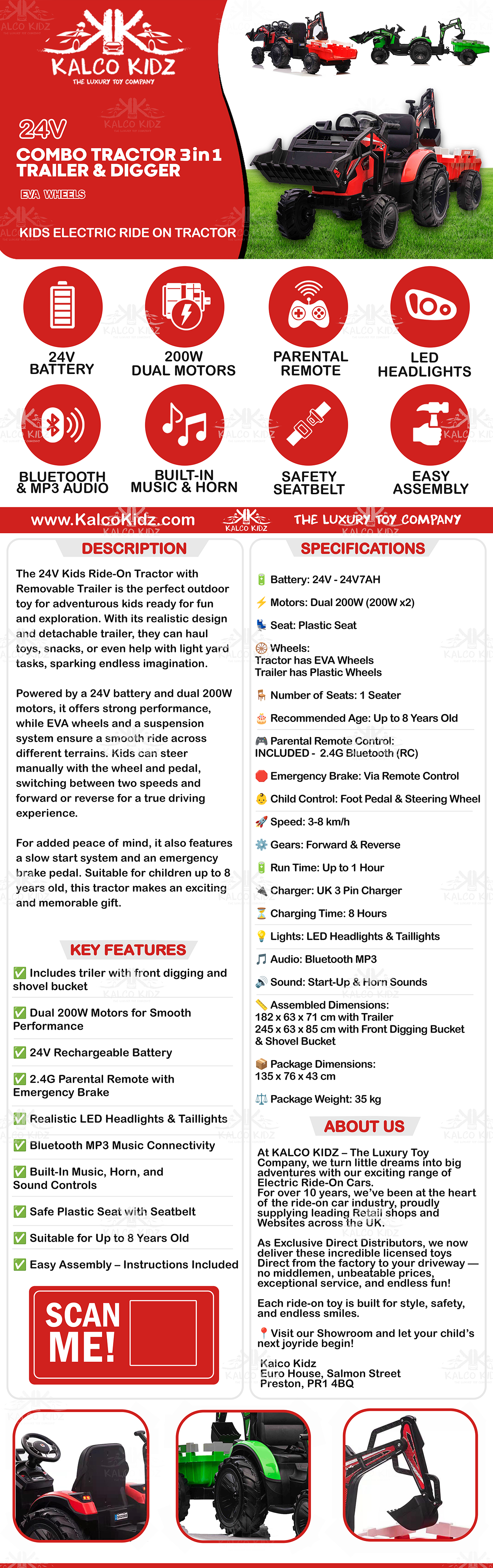 The Kids Electric Ride-On 24V Combo Tractor 3-in-1 in Green combines all the fun of farming and construction in one exciting package. Equipped with a front loader, rear digger, and detachable trailer, it’s designed for endless outdoor adventures with maximum versatility and fun.