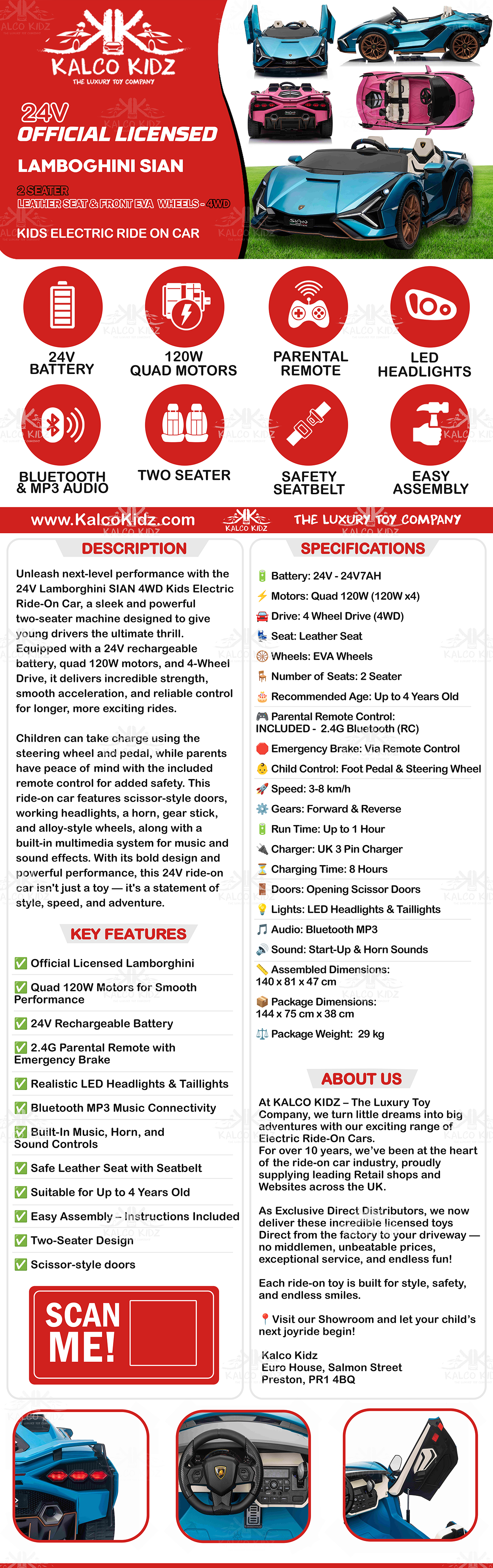 DESCRIPTION:Unleash next-level performance with the 24V Lamborghini SIAN 4WD Kids Electric Ride-On Car, a sleek and powerful two-seater machine designed to give young drivers the ultimate thrill. Equipped with a 24V rechargeable battery, quad 120W motors, and 4-Wheel Drive, it delivers incredible strength, smooth acceleration, and reliable control for longer, more exciting rides. Children can take charge using the steering wheel and pedal, while parents have peace of mind with the included remote control for added safety. This ride-on car features scissor-style doors, working headlights, a horn, gear stick, and alloy-style wheels, along with a built-in multimedia system for music and sound effects. With its bold design and powerful performance, this 24V ride-on car isn't just a toy - it's a statement of style, speed, and adventure.