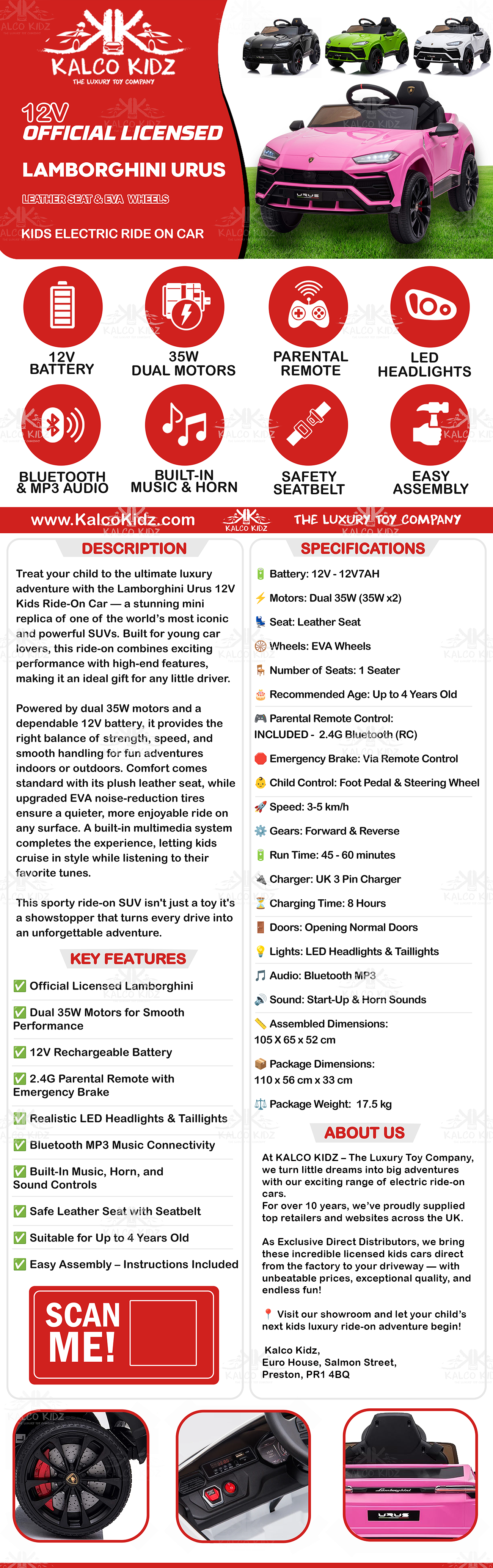 DESCRIPTION:Treat your child to the ultimate luxury adventure with the Official Licensed Lamborghini Urus 12V Kids Electric Ride-On Car — a stunning miniature version of one of the world’s most iconic SUVs. Built for young car enthusiasts, this kids electric ride-on car blends authentic Lamborghini styling with smooth, reliable performance, making it the perfect first vehicle for any little driver. Powered by dual 35W motors and a 12V rechargeable battery, it delivers the perfect balance of strength, safety, and stability for adventures both indoors and outdoors. Parents can stay in full control with the 2.4GHz Bluetooth remote, while children enjoy an exciting, realistic drive with working LED headlights, horn sounds, and a built-in Bluetooth MP3 music player for their favourite tunes. Designed for children aged 1–4 years, the Lamborghini Urus ride-on SUV provides comfort and confidence with its upgraded leather seat and secure seatbelt. The EVA soft rubber wheels ensure a smooth, quiet ride across multiple surfaces, giving young drivers a stable and enjoyable experience every time. With its sharp lines, signature Lamborghini design, and officially licensed details, this 12V kids ride-on car turns every driveway into a racetrack — transforming ordinary playtime into an unforgettable driving adventure.