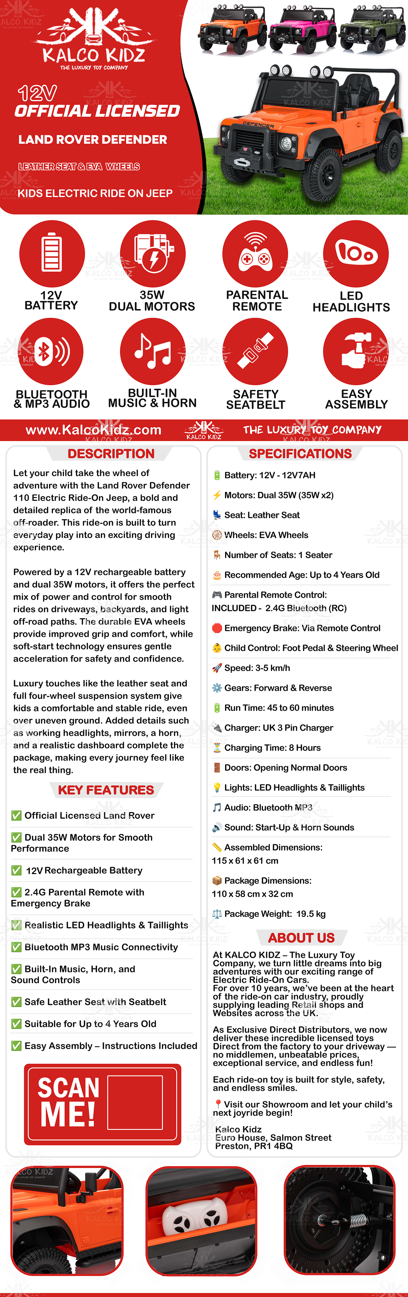 DESCRIPTION:Let your child take the wheel of adventure with the Land Rover Defender Electric Ride-On Jeep, a bold and detailed replica of the world-famous off-roader. This ride-on is built to turn everyday play into an exciting driving experience. Powered by a 12V rechargeable battery and dual 35W motors, it offers the perfect mix of power and control for smooth rides on driveways, backyards, and light off-road paths. The durable EVA wheels provide improved grip and comfort, while soft-start technology ensures gentle acceleration for safety and confidence. Luxury touches like the leather seat and full four-wheel suspension system give kids a comfortable and stable ride, even over uneven ground. Added details such as working headlights, mirrors, a horn, and a realistic dashboard complete the package, making every journey feel like the real thing.