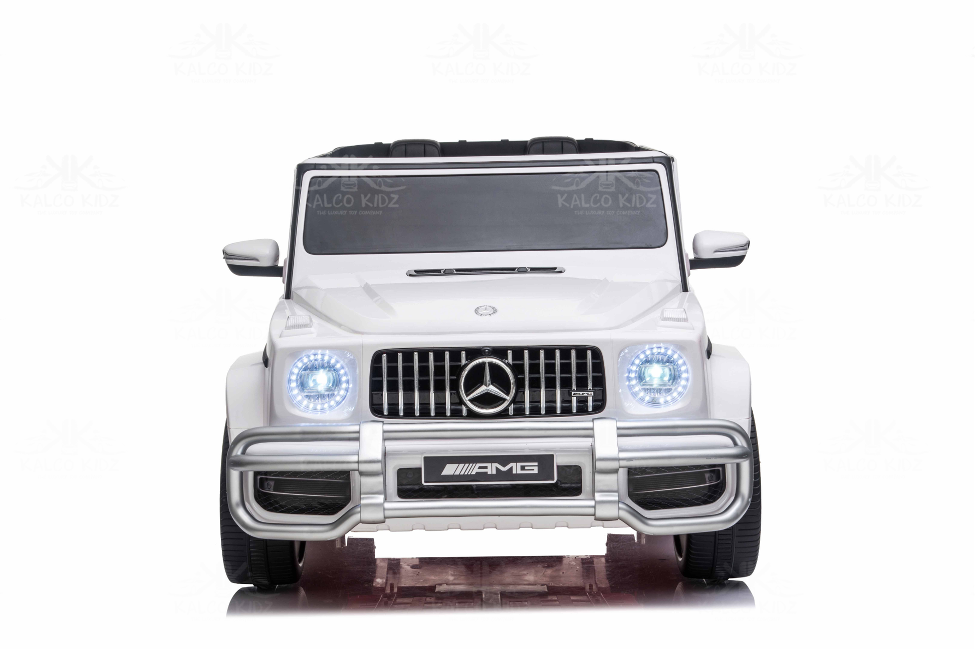 The Kalco Kidz Mercedes G63 AMG 24V White Edition offers unmatched comfort and realism. Its quad 4WD drive system gives power and precision over driveways or light off-road terrain. The EVA tyres and spring suspension ensure a smooth, stable ride, while the dual leather seats provide comfort for two passengers.
