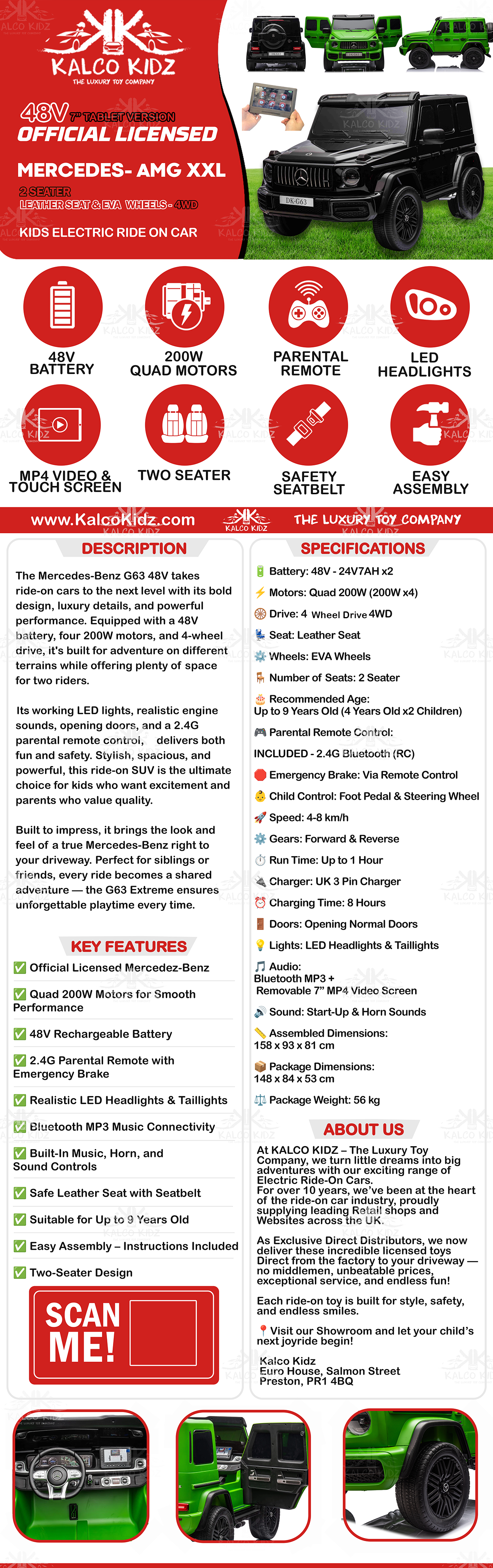 Description:Mercedes-Benz G63 48V takes ride-on cars to the next level with its bold design, luxury details, and powerful performance. Equipped with a 48V battery, four 200W motors, and 4-wheel drive, it's built for adventure on different terrains while offering plenty of space for two riders. With working LED lights, realistic engine sounds, opening doors, and a 2.4G parental remote control, it delivers both fun and safety. Stylish, spacious, and powerful, this ride-on SUV is the ultimate choice for kids who want excitement and parents who value quality. Built to impress, it brings the look and feel of a true Mercedes-Benz right to your driveway. Perfect for siblings or friends, every ride becomes a shared adventure - the G63 Extreme ensures unforgettable playtime every time.