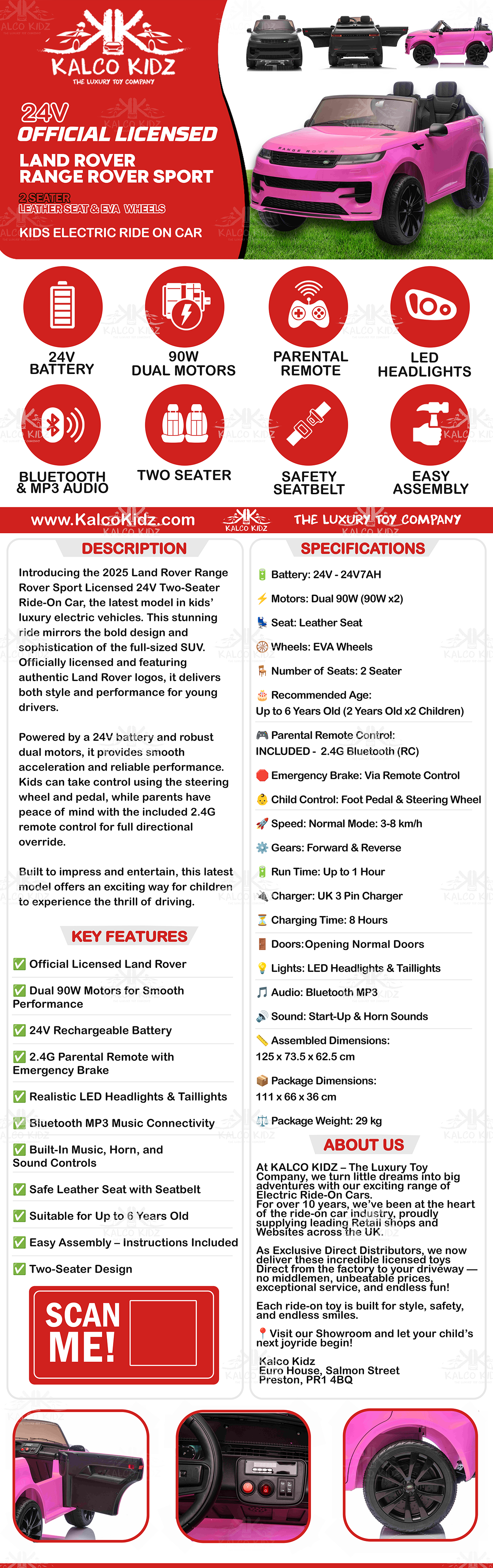 DESCRIPTION:Introducing the 2025 Land Rover Range Rover Sport Licensed 24V Two-Seater Ride-On Car, the latest model in kids’ luxury electric vehicles. This stunning ride mirrors the bold design and sophistication of the full-sized SUV. Officially licensed and featuring authentic Land Rover logos, it delivers both style and performance for young drivers. Powered by a 24V battery and robust dual motors, it provides smooth acceleration and reliable performance. Kids can take control using the steering wheel and pedal, while parents have peace of mind with the included 2.4G remote control for full directional override. Built to impress and entertain, this latest model offers an exciting way for children to experience the thrill of driving.