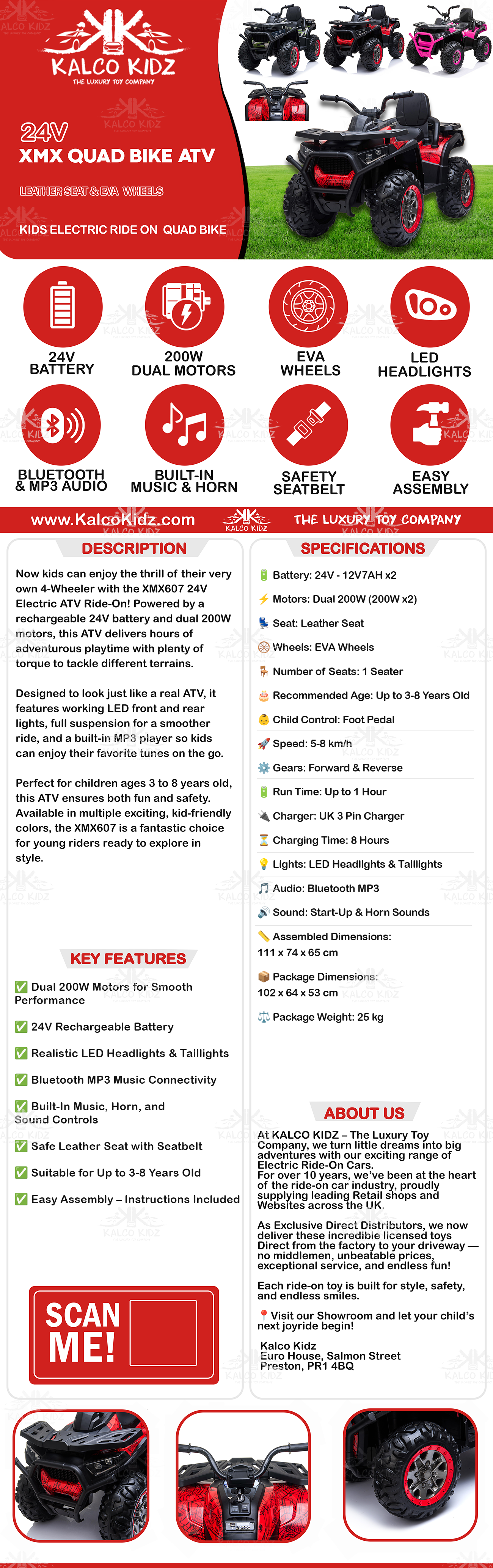 Theย Kalco Kidz XMX Quad Bike 24V Pink Edition is built to handle any terrain. Its dual 200W motors provide strong torque for off-road paths, while the EVA tyres and spring suspension keep the ride smooth and comfortable.